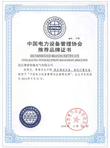 资质名称: 中国电力设备管理协会推荐品牌证书 |