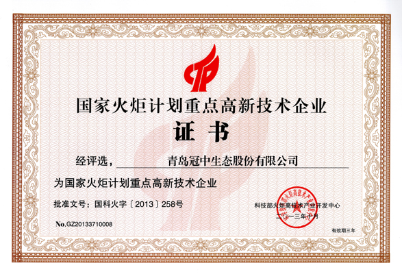 国家火炬计划重点高新技术企业证书