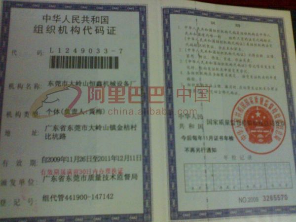 | 持证单位: 东莞市大岭山恒鑫机床设备厂 |