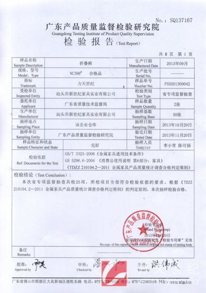 产品名称: 折叠椅检验报告 |